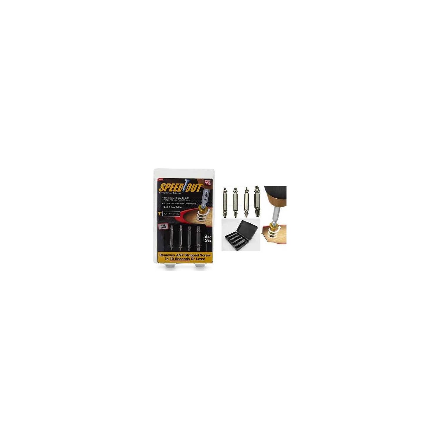 Speed Out Hasar Görmüş Vida Çıkarıcı Tamirat ve montaj işlerinde uğraşırken sorunlu vida problemini Speed Out Hasar Görmüş Vida Çıkarıcı ile ortadan kaldırın! Speed Out mutfak, banyo, dolap, çekmece vb yerlerde hasar görmüş vidaları kolayca söküp, çıkarmaya yarayan son derece pratik bir üründür. Hepimizin karşılaştığı bu duruma artık bir son veren Hasar Görmüş Vida Çıkarıcı Speed Out tüm işlerinizi sorunsuz ve hızlı bir şekilde halledebileceksiniz.   Speed Out tüm sorunlu düz ve yıldız vidaları yerinden kolayca söker. Hasar Görmüş Vida Çıkarıcı birbirinden farklı 4 uç seçeneği ile her türlü paslanmış, yalama olmuş, körelmiş, eğilmiş, yamulmuş vidaları kolayca yerinde söker atar.   Ürün Özellikleri: 4 farklı uç Her türlü matkap ve vidalama aletleri ile uyumlu Paslanmaz çelik Kolay ve hızlı kullanım Tüm sorunlu vidaları kolayca söker   Paket İçeriği: 1 adet 1′ (inç) Vida Çıkartma Ucu 1 adet 2′ (inç) Vida Çıkartma Ucu 1 adet 3′ (inç) Vida Çıkartma Ucu 1 adet 4′ (inç) Vida Çıkartma Ucu