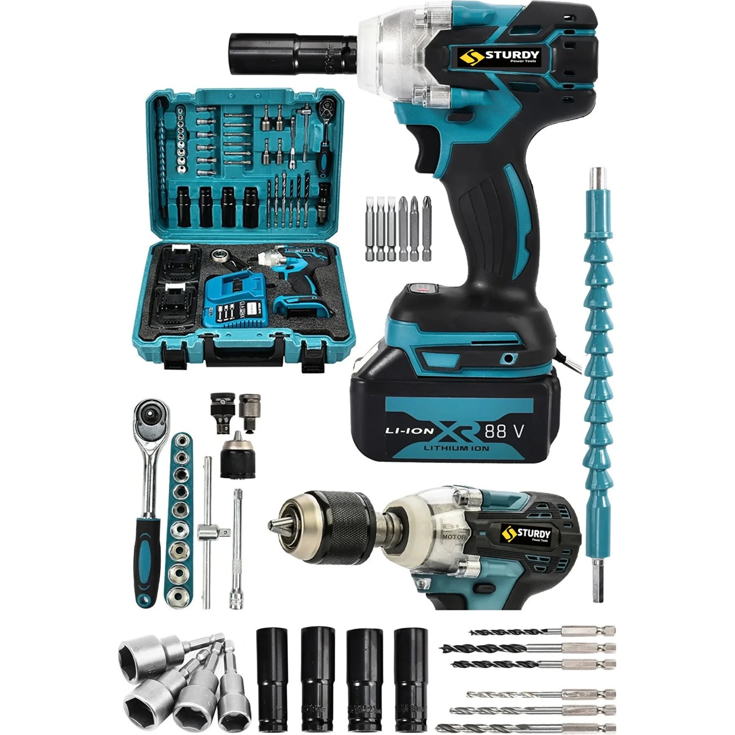 Sturdy 88 V 10 Ah Profesyonel Çift Akülü Cırcır + Mandren Şarjlı Somun Sıkma Torklu Vidalama Matkap 2 Alet 1 Makina Setli Çanta