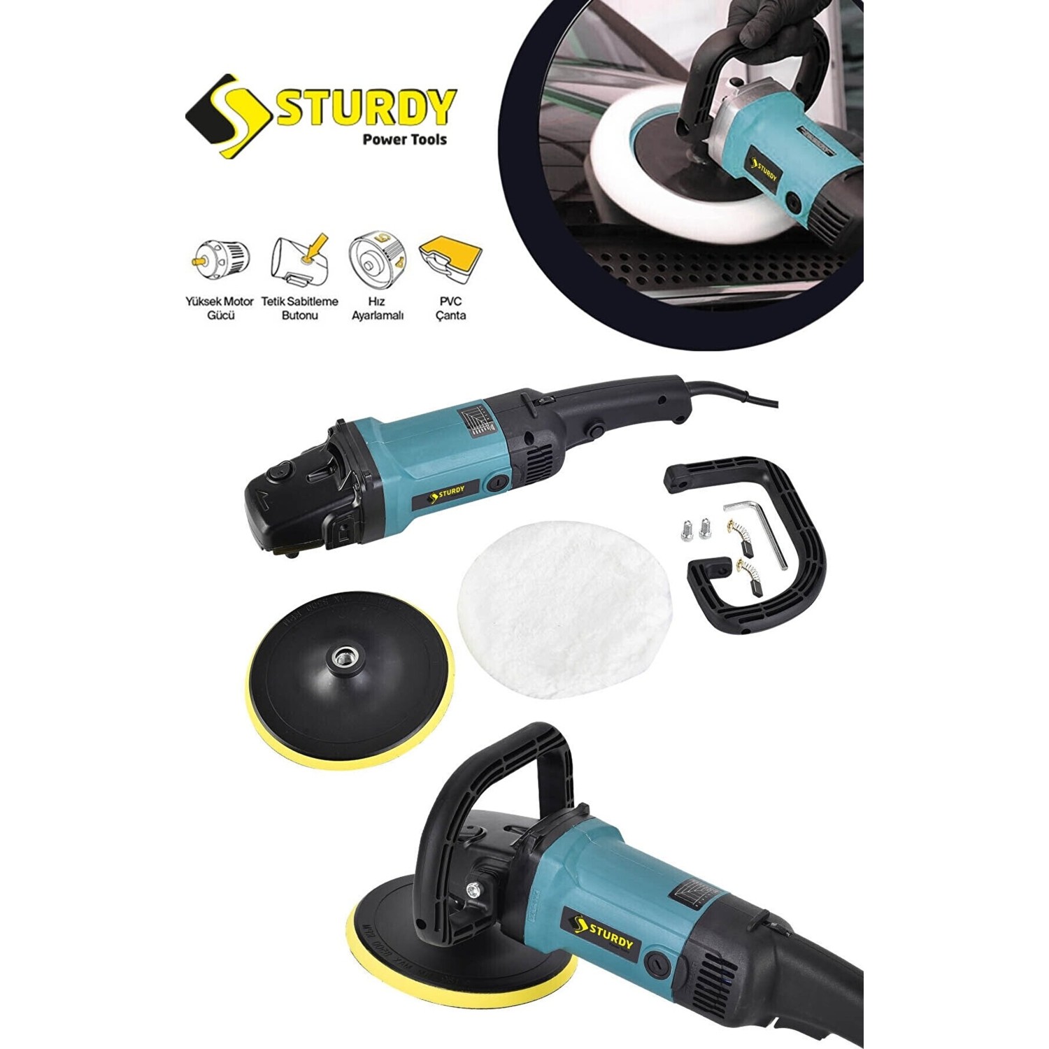 Sturdy Japon Tecnologhy Du6 Profesyonel Polisaj Makinası 4400 W 180 Mm 6 Kademeli Pasta Cila Uygulama Uzman Sjs Metal Şanzıman Polisaj Ve Pasta Cila Makinesi Profesyonelmetal şanzıman polisaj ve pasta cila Makinesi profesyonel Özellikleri Kauçuk kaplı vites kutusu muhafazası, kullanıcının ısıdan etkilenmeden konforlu bir şekilde vites kutusu muhafazasını tutmasını sağlarElektronik hız ayarlı tetik kullanıcının aletin hızını tetiğe bastırarak ayarlamasını sağlarGeniş kesintisiz elektronik hız ayar düğmesi kullanıcının aletin hızını yapılan uygulamaya göre değiştirmesini sağlarDeğiştirilebilir, pamuk girişini önleyici kapaklar, bone kullanımda pamuğun alet içine emilmesini önleyerek motorun tıkanmasını engellerIstem dışı çalıştırmayı önleyen akım korumalı tetik, aletin tetiği açık olsa dahi fişi takılıyken çalışmaya başlamasını önler. Tetik güç verilmeden önce bilinçli olarak sıfırlanmalıdırKauçuk kaplı arka tutma kolu kullanım sırasında kullanıcıya yüksek konfor sunarGeniş mil kilidi düğmesi tabanın kolay değiştirilmesini sağlarSigortalı kömürler, kömür bittiği zaman armatürün zarar görmesini önleyerek daha uzun motor ömrü sağlarTeknik özelliklerigiriş gücü4400 wattYüksüz hızı0-600/9500 dev/dakMaksimum disk çapı150 & 180 & 230 mmMil bağlantı dişiM14Ağırlığı3.0 kgUzunluk480 mmYükseklik135 mmStandart teçhizat180mm kendinden yapışkanlı sünger